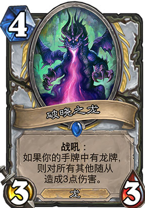 炉石传说狗头人与地下世界牧师新卡——破晓之龙,4费3-3,龙,战吼:如果你手上有龙,对所有随从造成3点伤害。(小型龙息,龙牧新贵,强无敌)
