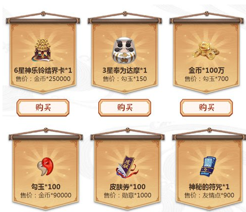 包含:御行达摩*2,4星奉为达摩*3,大吉达摩*4,金币*100000