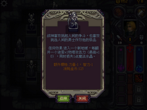 信仰效果:进入一个新地城,每翻开一个迷雾加1攻击(最多 +10),同时损失一点魔法水晶额外牺牲:力量-1 智力-1,10%当前金币 +10金币