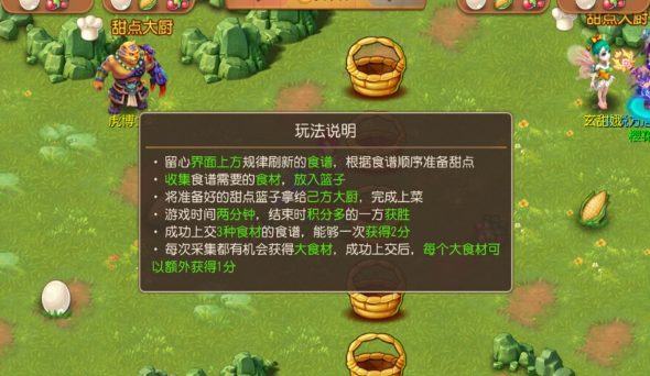 根据界面上方刷新的食谱收集食材,放入篮子,交给己方大厨