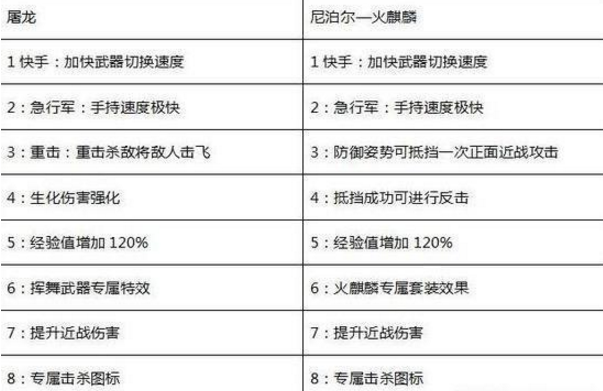 从上面的数据就可以非常直接的看出来两把武器的属性都是十分优秀的,而且各有亮点。先说屠龙,从属性上就可以想象在生化模式中会欧多么优秀的表现了,强化了生化属性又提高了生化的伤害,对于喜欢刀僵尸的小伙伴来说这就是不二选择。屠龙还有击飞的属性,通过重击将敌人击飞。这个技能是十分的炫酷有没有,小编对于这个属性可以说是情有独钟。