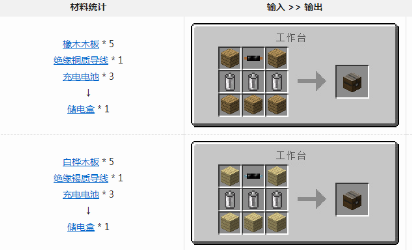 存电盒是一种小型固定式存电设备。最大输入/输出电压为32EU/t,最佳连接电线是铜线,储存上限为40000EU。