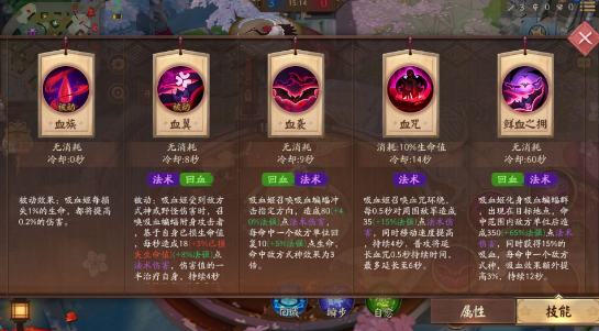 大招:自己变为吸血蝙蝠出现在指定的位置,命中式神提升15%的吸血效果,额外命中一个提升3%的吸血效果,持续12秒。