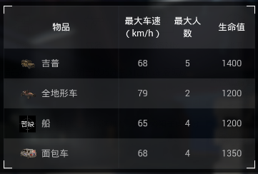 | 车辆 | 最大车速(km/h) | 最大载人量 | 最大生命值 |