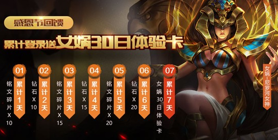 3、感恩你的等待:新英雄-女娲登录送30日体验卡(11月21日开启)