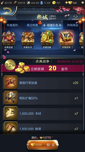 内容:高级行军*20、50%部队扩编、木材150万*7、粮草150*7、金币20。