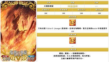 只有贞德(Alter)(Avenger)装备时,自身在场期间,我方全体的Buster卡性能提升15%