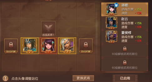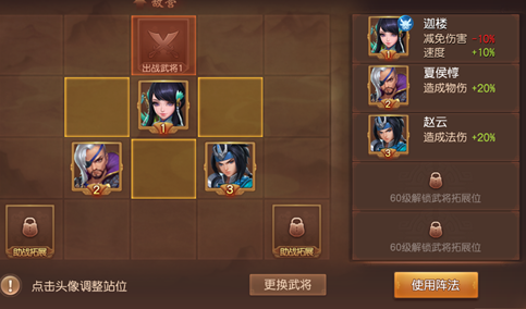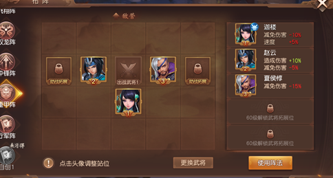 选择适合的阵法后,点击使用阵法即可切换当前使用的阵型。阵法上每个角色位都有不同的属性加成。出战武将没有阵法加成。
