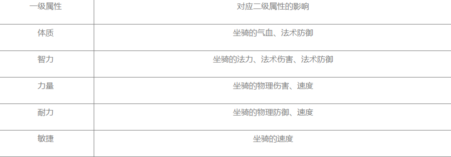 坐骑属性分为一级属性跟二级属性。一级属性对坐骑二级属性的影响如下: