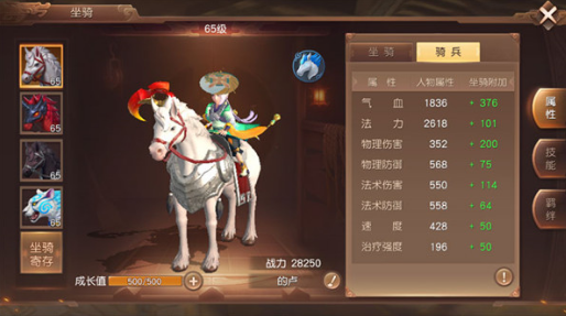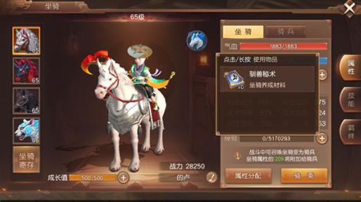 除此之外,还可以在金币商城中购买驯兽秘术为坐骑增加经验。达到一定等级后,就会解锁与角色的羁绊,每条羁绊都会对角色属性有一定的加成。无论什么时候,等级都是非常重要的。