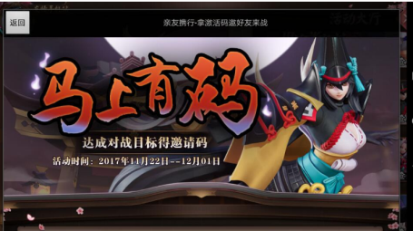 决战平安京马上有码活动已经正式开启,不少小伙伴们最关心的就是这个邀请码获得的方法是什么,不太清楚的小伙伴们,就让小编给大家详细的讲讲,一起来看看吧。