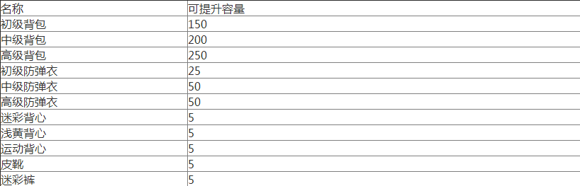 容量决定了可携带武器的数量、重量,提升容量的方式主要依靠背包,衣物方面也可小规模提升。