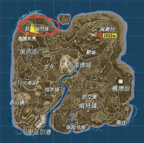 危险品仓库,只有黄色二等房屋数座,里面含有少量枪械及弹药,有概率出现高级倍镜。(小编能吐槽这鬼地方么,有一次独自探索完,就一把AKM外加120发步枪弹,没了!对你没看错!没了!就这么多重武器!散弹枪、冲锋枪倒是有几杆,弹药同样稀少。)