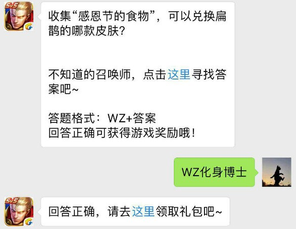 王者荣耀11月24日每日一题题目:收集“感恩节的食物”,可以兑换扁鹊的那款皮肤?(答题格式:wz+选项,例如答案是王者荣耀,则需输入:wz王者荣耀)