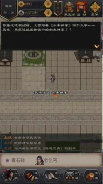 老乞丐(60,20),打听五香猪肉包,从香兰阁(21,50)购买五香肉包给乞丐,给10几次包子会得到《如来神掌》。