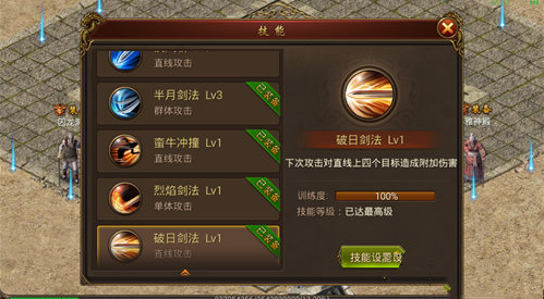 在技能加点方面,个人推荐烈焰剑法和蛮牛冲撞,这两个技能的适用面很广,其中蛮牛冲撞可以在PK中靠近敌人,还能在副本中逃生,烈焰剑法则是对单输出的王者。另外,初级剑法作为增加准确度的别动也要点满。