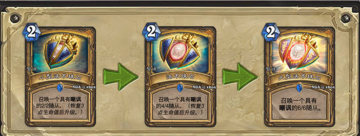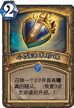 炉石传说狗头人与地下世界圣骑士新卡——小型法术珍珠(暂译),2费法术:召唤一个2/2并具有嘲讽的随从(恢复3点生命值后升级)