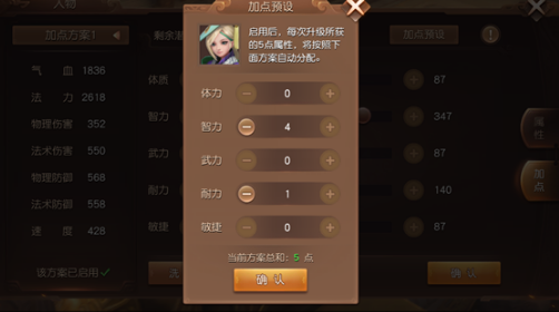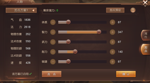 加点预设可以设定每次升级获得的自由潜力点的分配方式,默认的加点方案每个门派各不相同,可以随时修改