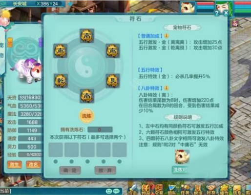 (5)若存在四个以上八卦文字相同的符石,宠物将获得八卦特效,所有符石八卦相同时效果更强。
