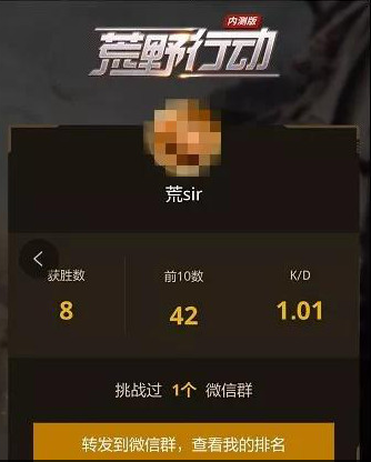 在这里,你可以随时随地查阅不同人的战绩,并且还能转发到微信群与他人一起见证自己怎样从菜鸟蜕变为大神的成长之路!当然还可以和朋友们相互PK看看谁更能在荒野上称霸四方挑战的微信群越多就更能证明你荒野精英的含金量!