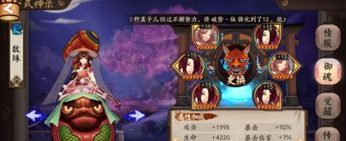 大天狗,应对般兵等双控加辣条阵容,在我方基本放弃镰鼬的情况下,面对双控套圈不能完全指望抵抗数珠,用大天狗作为反击点,而且我的天狗因为是魍魉套有五十多的抵抗,所以偶尔可以自强抵抗。