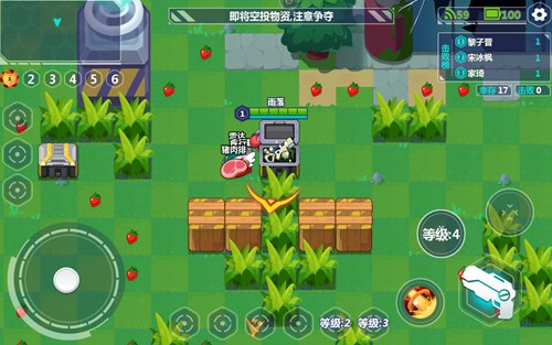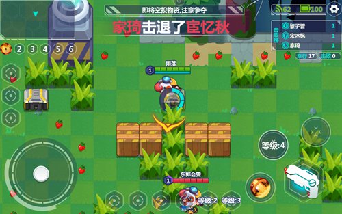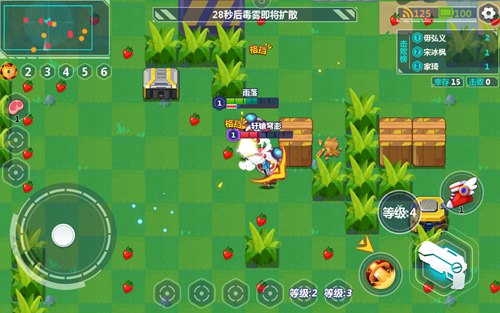 进入场地后,我们首先要做的就是“猥琐发育”,在地图中有很多散落的草莓,收集这些草莓可以提升我们的等级。