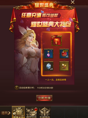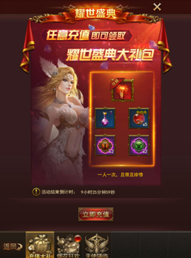 活动期间充值任意金额可领取丰厚的奖励,活动期间每人仅可领取1次