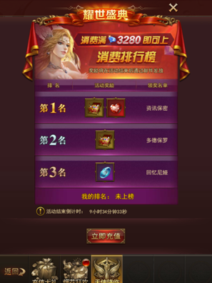活动期间消费钻石达到3280钻石以上并且本服消费前三名的玩家可以获得以下道具:
