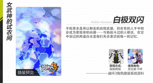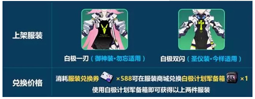 同时,服装白极一刃(御神装·勿忘适用)、白极双闪(圣仪装·今样适用)也将上架服装商城!
