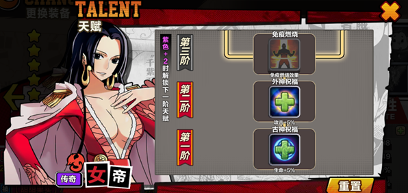 次元幻境的天赋系统是玩家必须将角色晋升到一定品质,才能解锁的一个属性加成系统,在天赋系统中分为五个不同阶段,角色不同每个阶段的天赋效果也各不相同。升级天赋的时候一定要看清楚下一阶属性的介绍哟,不然重置天赋点是要消耗钻石的。