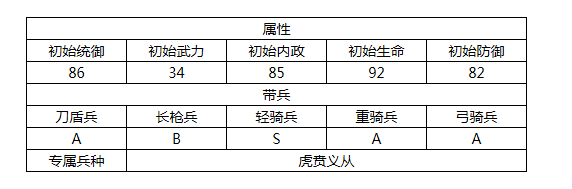 轻骑兵统领,有着专门正对弓兵的buff,是强力的对弓兵武将