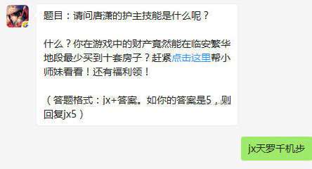 首页 → 安卓游戏资讯 → 安卓游戏攻略 → 新剑侠情缘手游唐潇的护主技能是什么 11月29日每日一题答案