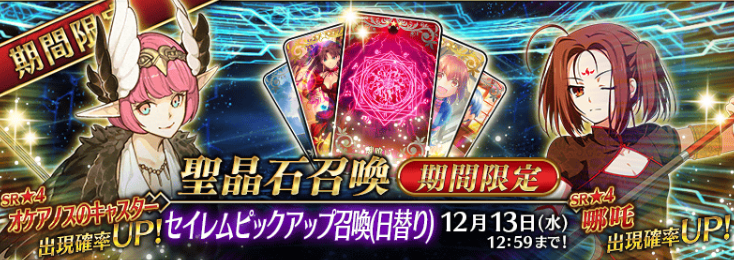 「亚种特异点Ⅳ 禁忌降临庭院 塞勒姆 异端的塞勒姆」内活跃的英灵「★4(SR)哪吒」「★4(SR)俄刻阿诺斯的Caster」将作为新英灵登场。上述两位英灵将进行日替pick up!