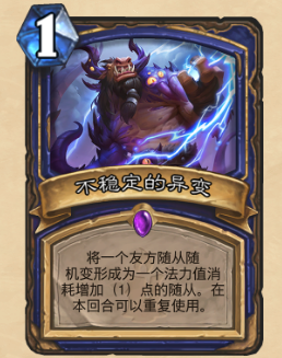 1费,将一个友方随从随机变形成为一个法力值消耗增加(1)点的随从。该法术在本回合内可以重复施放。