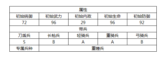 很实用的刀盾兵武将,技能和缘分都能很有效的压制步兵,是前排忠实的护盾。