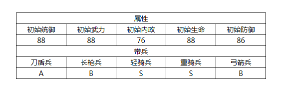 【普通攻击】每7秒,对敌方移动速度最慢的兵种造成自己武力相关伤害