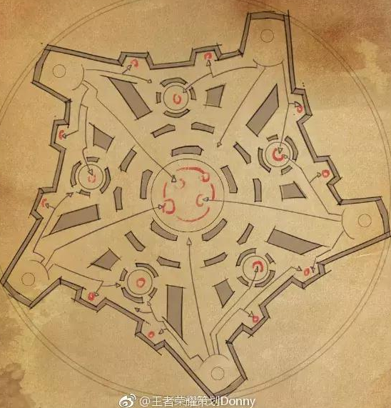 按照@王者荣耀策划Donny的说法,“五军之战”模式将有五支队伍互相厮打,一局可以容纳25人。另外,没有兵线也没有水晶的设计表明,这一模式完全与推塔无关,或许只能依靠杀人以及地图上的野怪BUFF发育、获得金币购买装备。图中用红色标记出来的可能是野怪之类的峡谷生物。