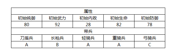 很强力的重骑兵武将,有着强大的攻击与防御,能够对弓兵形成有效的压制。