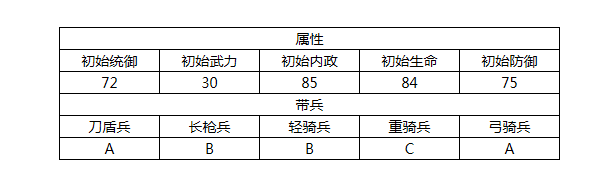 很强力的刀盾弓箭武将,能有效的针对低防御的方阵,打击地方弱点。