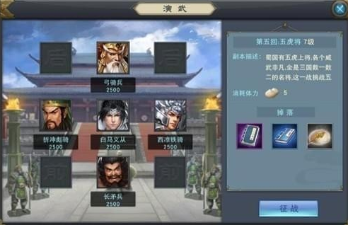 西蜀演武是新手阶段打的,此时兵等级低,武将比较差,所以通关该演武比较适合兵力压制。