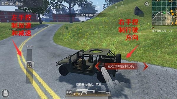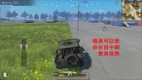 游戏中的载具非常丰富,操作的时候需要左右手同时使用,左手用来控制速度,右手用来调整方向。这里需要注意左手可以同时加速和减速,所以手不要放在虚拟的速度条上,而是放在虚拟速度条左侧,这样方便观察当前的速度,也方便快速减速停车。载具可以帮助我们快速达到指定目标区域,并且同时还具有一定的防弹功能,不过有时候也容易暴漏目标,在指定目标区域非常小的时候,可以放弃载具改为徒步行走。