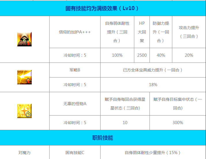 自身的弱体耐性提升(3回合),HP大回复,防御力提升(1回合),攻击力提升(3回合)