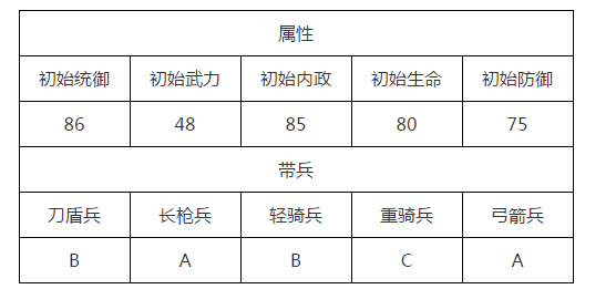 很强力的长枪轻骑武将,能对其他步兵进行强力攻击,是各种情况下都能上场的中排武将。