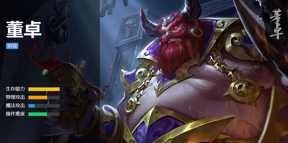 董卓的1技能虽然距离远,但是他命中的目标却是路径上第一个命中的敌人,所以无论是补兵还是控制,尽量记住这个技能设计。当敌人前方有很多小兵时,尽量不要贸然使用控制技能,因为1技能很容易命中小兵,但是你也可以通过2技能的位移接近对手,再控制对手,将提高自己1技能命中对手的概率,从而配合队友Gank和击杀。如果董卓自己单路发育的时候被对方消耗较惨的情况,则可以通过1技能的命中回复血量,同时优先加点3技能,回复血量,再利用自己出门带的血瓶,持续保持健康血线,等到队友支援,可以完美反杀。