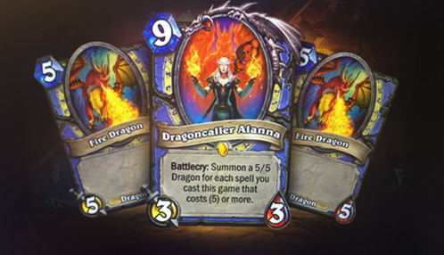战吼:本局游戏中你每施放一个法力值消耗为(5)或(5)以上的法术,就召唤一个5/5的巨龙。