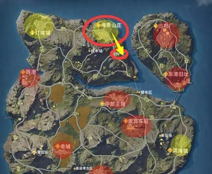 海景山庄位于地图的正北方位,虽然附近就是大海但却四面环山。海景山庄拥有2条街道,建筑与建筑之间的距离相对较远,适合城镇巷战与蹲点。一般海景山庄都会处在航线附近,但是不会有太多人选择此作为降临点。