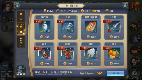 2、市场购买,我们的贸易就是可以市场里购买道具,经验书、羽扇、橘子、箭矢、等等道具,这里就是发家致富的地方了,我们购买到道具可以到指定的城里去卖,就是低价买入,高价卖出了,不过这个需要先打探情报,也可以自己先囤点材料。