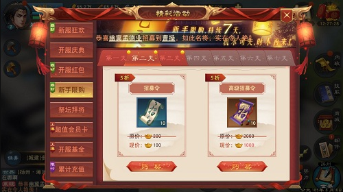 3)新手限购,开区活动,这里可以直接买到五折的要的话可以买一些,这里的话就是10张,1000元宝。