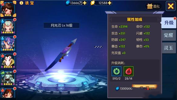 每个伙伴都有其一件专属法宝,获得法宝后,初始等级都为0级,若要培养法宝则必须先对其进行升级,每次升级将提升一种属性加成,生命、命中、闪避、攻击、防御、韧性、暴击、暴伤、先攻值,9大属性让你的法宝更上一层楼!