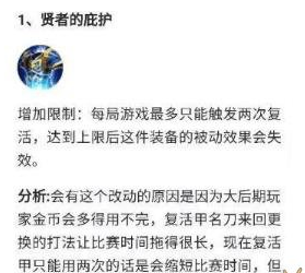 首先这件很久没有变动的复活甲被削弱了,下次更新后复活甲就只能复活两次,因为王者荣耀本来就是个快节奏的手游,很多玩家后期都是人手一个复活甲,这样玩起来很拖节奏。而且还有一部分玩家会秒换复活甲,后期就比别的玩家多几条命,这样时间就拖的更久了。